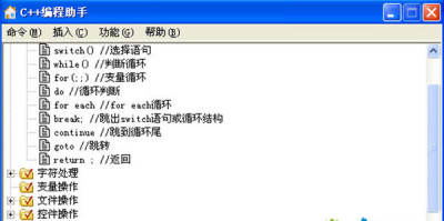 C++编程助手将一些常用或不常用的编程命令等添加到了列表中,方便用户使用,对于那些英文不怎么好的人是一种极大的帮助。