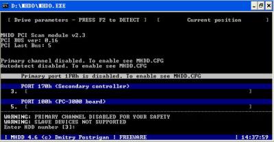 以上方法对?号和W坏道的修复好象还不是太完美,现在我们利用MHDD的一些命令进行辅助和配合,IBM、富士通、西数这些可以查看硬盘缺陷的,最好先执行IBME、FUJLST等命令,然后执行一般模式扫描,扫描到 W或者?这些难以修复的坏道时按ESC退出,用randombad及makebad命令进行坏道标记,反复操作,坏道多的话可以标记坏扇区段,标记完以后执行高级模式扫描。还有就是修改硬盘容量法,你比如说,IBM的低格程序中就有一项可以改硬盘容量,会低格的朋友应该都知道。这里,大家先把硬盘容量改为最小(这里的最小不是0M或者1M,而是硬盘总容量的整百M位,比如10G就改为100M,20G就改为200M),然后在用MHDD进行扫描修复