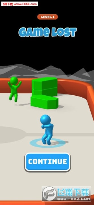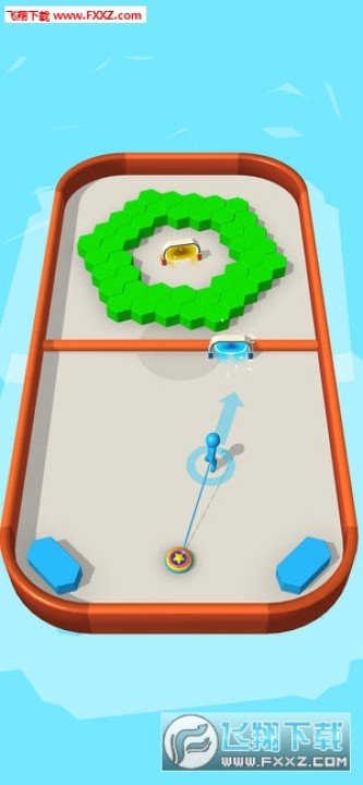 战斗曲棍球游戏的玩法很简单,这里有蓝绿两个小人,你要控制住其中的一个,让这个小人来投掷圆饼,就跟冰壶一样,让圆饼将你的对手后面的建筑全部击倒。