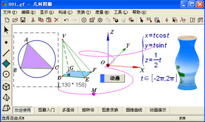 提供了丰富的画图工具,不仅可绘制平面几何与立体几何图形,也可绘制空间向量、曲线曲面、动点轨迹;它具有强大的度量、计算功能,能根据度量结果绘制点、实施变换。