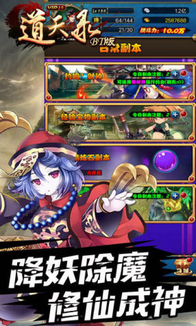 道天录折扣版是一款以西游题材为背景,卡牌策略类挂机休闲手游。重温西游经典,等你来屠魔。 合战世界boss、勇闯地府、仙境冒险、蟠桃园、锁妖塔、巅峰竞技等精彩活动带你玩转西游。一棍扫全军,千劫欲降妖。勇闯九九难关,尽灭魔神鬼怪,问天以道,修炼成圣!