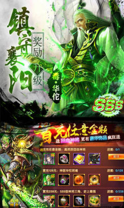 2. 充值比例首充最高可达1:1200,充值比例1:200,上线送38888元宝,vip14,铜钱288W(邮件领取),vip礼包包含SSS武将,顶级宠物白虎还有各种材料,拿到就是赚到!