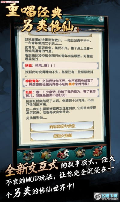 全新交互式的叙事模式,经久不衰的MUD玩法,让你完全沉浸在一个另类的修仙世界中;