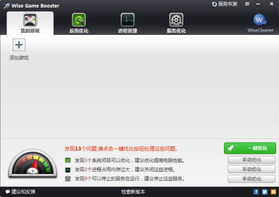 wise game booster是一款非常好用的游戏加速软件,通过禁用不必要的开机启动项,开机服务以及相关注册表项,并释放被不相干程序占用的大量内存,从而提升电脑的游戏性能。程序默认可以进行一些,推荐优化,当然用户也有很大的自主选择空间,来优化一些个性化项目。游戏优化器(Wise Game Booster beta)设计目的是让用户在不升级硬件的基础上,最大限度的提高游戏性能,让资源集中在游戏上,从而获得更佳的体验。