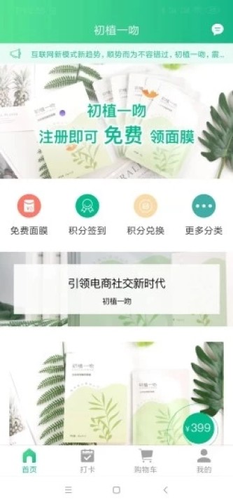 初植一吻是一款社交电商类APP,通过线上平台推广企业生产的纯植物面膜,客户使用面膜之后,实时分享使用面膜的真实感受,融合领域用户社交距离。