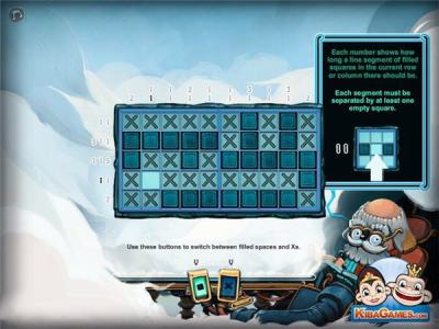 《元素拼图:方舟》的玩法和一般的数图游戏相同,玩家根据每行及每一列前面的数字,来推理出,方格区域中哪些方框应该是被实心方格填充的,哪些方框应该是空的,如果你确定某一个方框是空的你可以按住空格键再点击你所确定的那个空方框将会出现叉号标记在那个空方框上。当松开空格键,鼠标点击方框将会自动切换回实心方格填充模式。