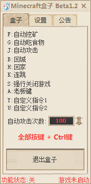 F:自动挖矿G:自动吃食物J:自动攻击B:回城H:回家K:连跳S:强行关闭游戏A:老板键Y:自定义指令1U:自定义指令
