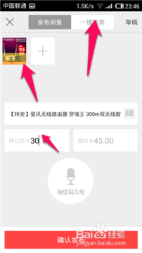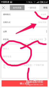 选择自己需要转卖的物品,输入价格,交易方式,联系方式等,方便别人需要买的时候咨询你。