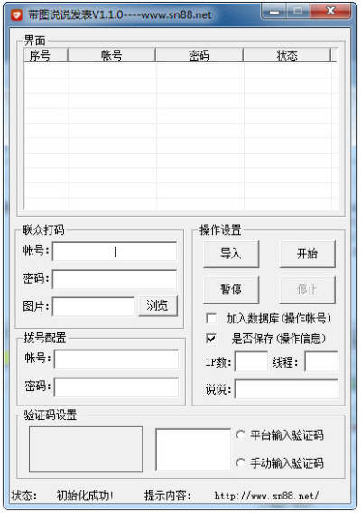少年图片说说是一款功能实用的免费图片说说发表工具,可进行批量说说发表,内置换ip功能,工作多少个号码后,自动换ip,保存操作信息,添加记忆功能。