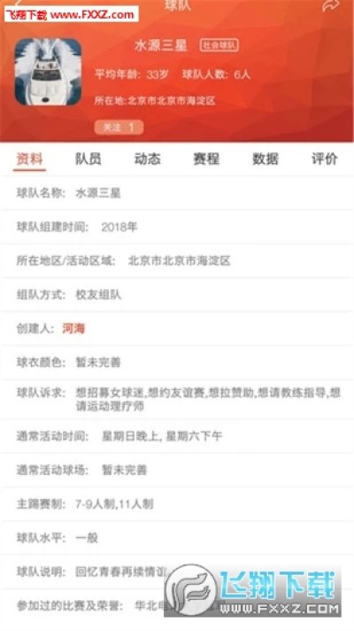在“球队”板块,可浏览搜索全国各地社会球队、大学生球队、青少年球队,并快速创建球队。按照组队方式,点击进入球队主页,可查看各类球队的资料、队员、动态、赛程、数据、评价等信息,关注该球队并进行在线聊天(与该队球队管理者)、申请入队及在线支付等操作。