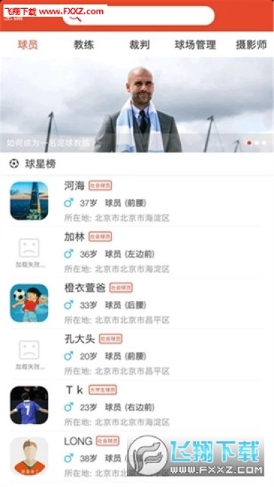 在“个人”板块,可浏览搜索全国各地球迷、球员、教练、裁判、球场管理、摄影师等角色,其中球员分社会球员、大学生球员、青少年球员三类。点击进入用户个人主页,可查看各类角色的资料、动态、数据及评价等信息,关注该用户并进行在线聊天、邀请入队及在线支付等操作。