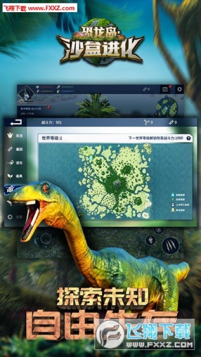 《恐龙岛:沙盒进化》是首款3D真实模拟恐龙生活的沙盒类生存游戏,在这广阔的恐龙世界,还生活着各种各样的凶猛恐龙和动物,你可以与之搏斗,厮杀,将其征服!体验在大自然中生存的艰难,不断的提升自己恐龙的等级,基因等等。更有趣的地方是,在这里你可以找到你的恐龙伙伴,与你一同生存,一同战斗。快来体验生存的不易和乐趣吧! 在游戏中,一共有两种不同类型的恐龙可供你选择,一种是肉食性恐龙“迅猛龙”,一种是食草的“副栉龙”。迅猛龙行动迅捷,攻击力高,适合喜欢挑战的玩家尝试,迅猛龙还可以进化为窃蛋龙,镰刀龙,最终进化可以进化为霸王龙,牛龙,棘龙中的一种。副栉龙生命顽强,防御力高,适合喜欢休闲的玩家尝试,副栉龙还可以进化为肿头龙,开角龙,最终进化可以进化为剑龙,甲龙,三角龙中的一种。 快来一起体验恐龙岛的自由生活吧!