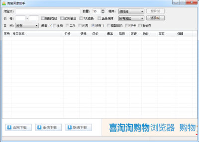淘宝买家助手是一款方便淘宝买家对淘宝的海量宝贝中的价格、快递费、已卖出数量、卖家信用、卖家好评率等信息进行搜索、比较、排序的绿色小软件。 淘宝上的宝贝铺天盖地,如何在这些信息中找到最便宜、最放心的宝贝? 不用开浏览器即可上淘宝网,更快的搜索速度,只获取关键信息,支持高级搜索。可以查看宝贝详情,交易记录,商家信用认证等信息。也可以直接跳转到淘宝页面。