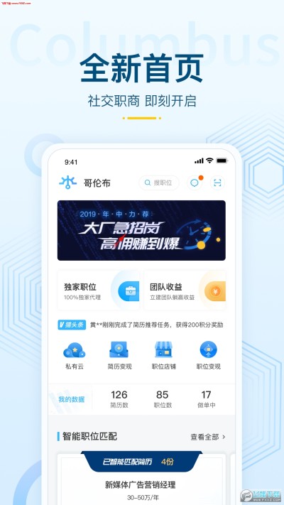 哥伦布是一款基于社交人脉变现的APP。在这里不仅可以实现职场资源一键撮合,还可以体会到人脉和资源带来的直接收益。AI智能推荐引擎实现精准人岗匹配,高效的简历资源复用,使用哥伦布,做单效率就是快人一步!