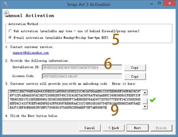 Step 3 -点击“Other Activation Options”(4),选择邮件激活(E-mail activation)(5),复制Installation Code(6)到注册机的对应位置(7),点击Serial Number旁边的Generate生成序列号(8),再将序列号复制到激活窗口对应位置(9),点击下一步;