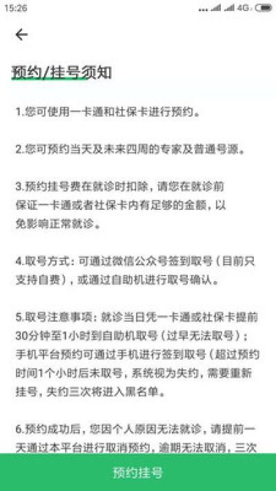 【预约挂号】提供本院全部科室普通门诊和专家门诊的预约挂号功能,患者只需一部手机,即可完成预约挂号。