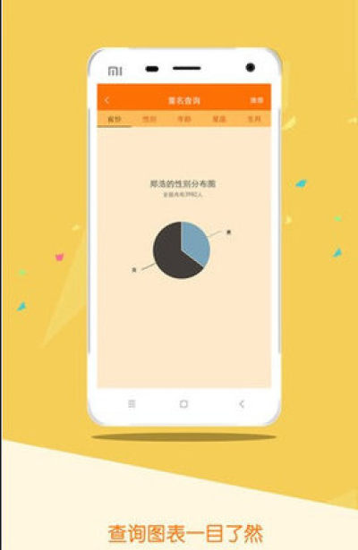 下载重名查询,只要输入您的名字,一键查询和你重名的省份分布图,性别分布图,年龄分布图,星座分布图,生肖分布图。