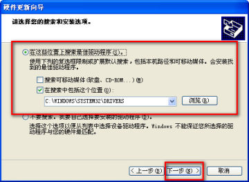 在硬件更新向导里, 如图选择安装,在搜索最佳驱动程序项中,点击浏览找到已经下载好的最近版本驱动程序。再点击(下一步)