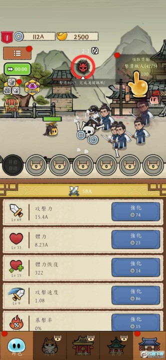 一款赤壁风格的武侠主题闲置休闲游戏。主角寻找志同道合的同伴,以增强各种技能并防止敌人的破坏。