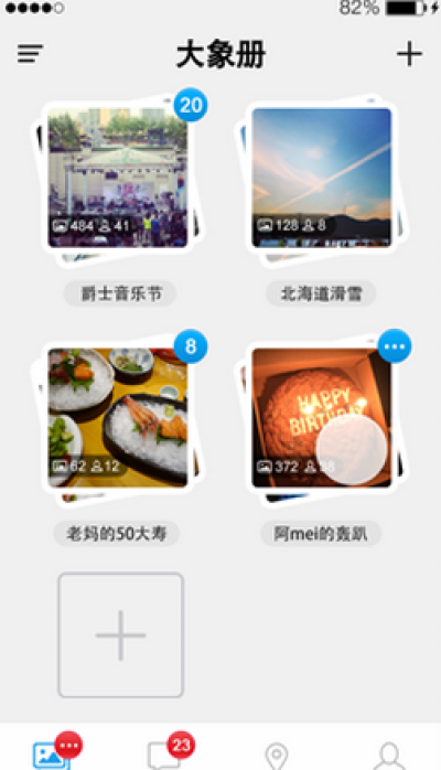 进入大象册点击加号创建按钮,即可创建相册,并获得一个独一无二的邀请码和二维码。用户可以设置册密码、私密相册以及设置相册成员的权限,包括评论、点赞、上传和允许加入。