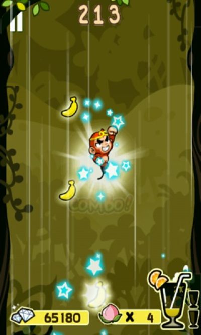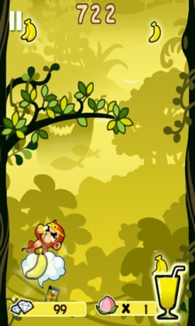 弹跳的过程中也会遇到很多的道具和障碍。非常值得一提的是前作的神灯和气球分别被替换成了天书和云朵。悟空腾云向上的时候吃香蕉的表情实在是让人欲罢不能啊。收集足够的香蕉之后悟空可以喝掉果汁来换取向上弹跳的力量,这也是远离金刚的一个绝妙技能。