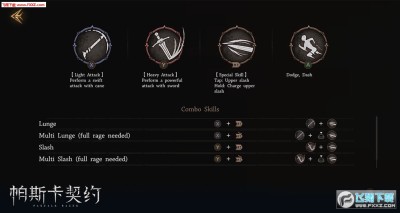 泰伦斯:在试玩版中泰伦斯的武器是手杖和剑,轻击是用手杖攻击,重击是用剑攻击。轻击和重击都可以最多连续攻击3次。防御(长按)可以抵挡部分伤害。而防御键也可以用来弹反。闪避系统按一下是垫步,快速按两次翻滚闪避。轻击中按重击是轻战技(需怒气30%),长按重击ex轻战技(满怒)重战技和ex重战技同理。