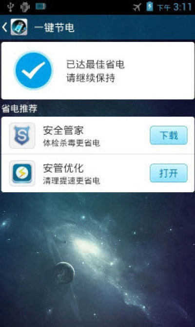 耗电统计:一目了然,手机中什么软件最耗电。还支持查看详细的软件、硬件耗电数据统计,并设有“关闭”按钮,可快速对耗电软件进行关闭,以达到节省电量目的,一手掌握手机的耗电情况。