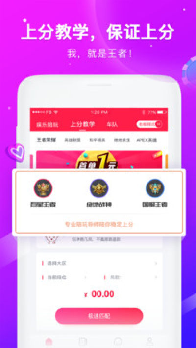 平台将游戏高玩、王者大神与普通玩家便捷串联,有上分教学、娱乐陪玩、组队游戏(车队)等多种服务。