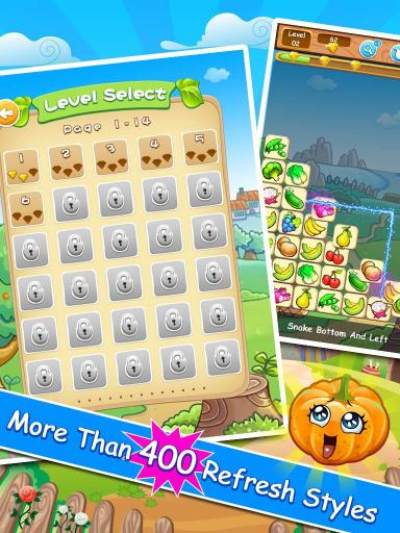 将两个相同图案的水果,之间连线拐弯不超过两个就可以消除掉,你需要把整个版面的水果图案消除完毕,并且要尽量快地完成。