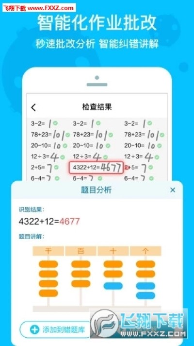 *拍照批改:打开摄像头拍一拍,就能识别并批改作业啦!既能整页纠错,也能单题扫描,批改功能与智能讲解链接,点击题目框还能观看讲解。