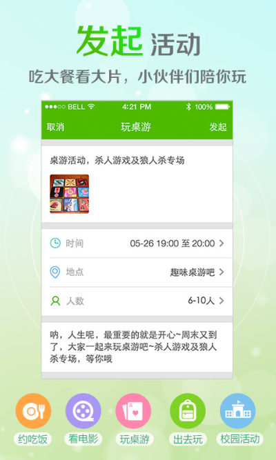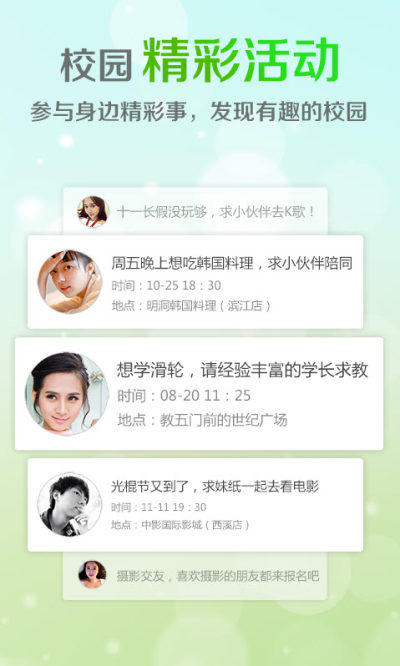 你不仅能参加身边的精彩活动,还能认识新的小伙伴,吃大餐,看大片,一起纵情欢乐。
