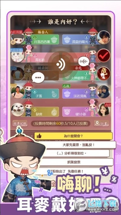 全民一起凹鸣官方版为玩家呈现了一款独具古风宫廷韵味的狼人杀竞技游戏。在这个游戏中,你将有机会与多名玩家一同踏入这个宫廷世界,展开一场场紧张刺激、考验智慧的竞技对抗。