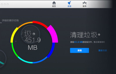 垃圾清理页面,左边的主体形象是一个飞船“推进器”(或者是个观星望远镜),配合扫描、清理垃圾的指令,“推进器”会有相应的动画效果。目前清理的内容支持:日志和缓存、开发者垃圾、无用的二进制、无用的语言包、损坏的配置和注册项、iOS升级软件、应用程序残留、浏览器缓存等内容。