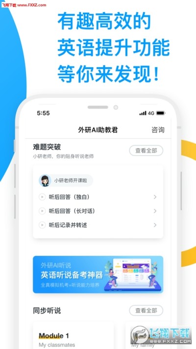 - 同步听说:教材同步课文听读跟读,提供单词级的即时反馈,细化训练颗粒度