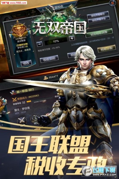 国王联盟权力:国王联盟除了享有每日系统赠送的最高奖励外,还有很多的权力,最大的权力就是可以收税,确定税率,领主联盟和普通联盟在税收方面都受国王联盟的控制。每日21点系统结算便是按照国王联盟规定的税率来结算的。而且世界上的城池的玩家都需向国王联盟纳税,得到税收后盟主可以进行内部税收分配,自己的属下能获得多少资源就全靠盟主啦!