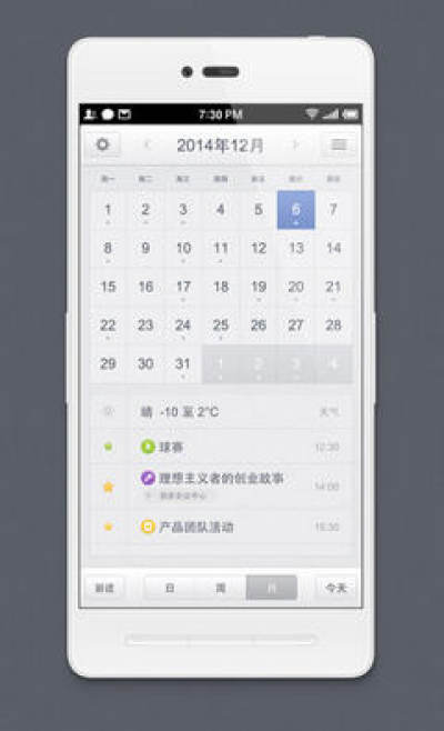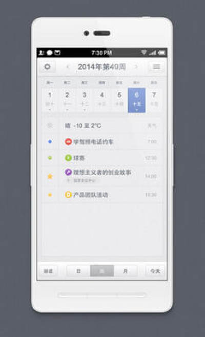 5、近期天气显示:日、周、月视图支持显示未来五日天气预报;在新建或编辑任务界面选择日期时,锤子日历也会贴心的显示天气信息,以方便您安排任务;