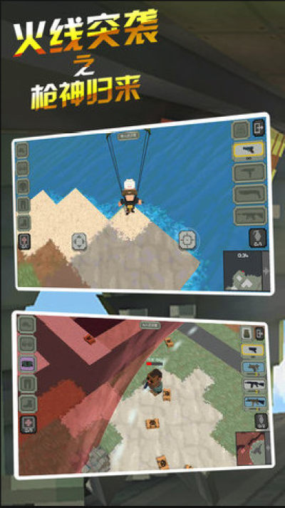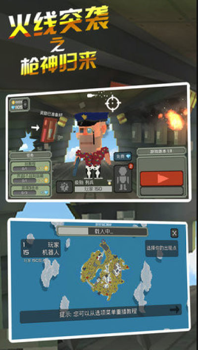 火线突袭之枪神归来求生这款游戏是一款以吃鸡为主的方块世界游戏,玩家们在游戏中将会体验到不一样的吃鸡快感,非常的好玩,游戏中融合了大乱斗的游戏概念,玩家们和其他的玩家们一起组队,共同进行生存对抗,运用策略多多生存下去吧。