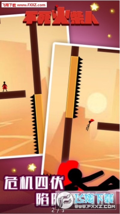 不死火柴人一款横版冒险动作手游,控制着火柴超人在陷阱重重的关卡中勇往直前,在各种浮空的平台之上进行跳跃,使用你灵敏的手指帮助火柴人灵敏的躲避着突然出现的机关,展示出你惊险的极限操作,让火柴人能够安全的抵达终点。