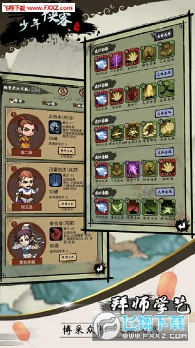 总之这是一款武侠题材的放置挂机点击RPG游戏,游戏以武功为核心玩法,玩家通过挑战宗师,而后拜师习得武功,再通过不同的武功套路挑战各大武林高手,进而一步一步成为独步武林的大侠!