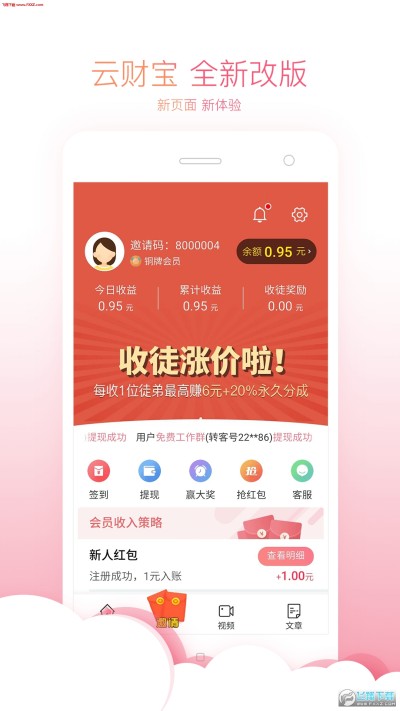 云财宝app是一个转发文章赚钱的平台,每天都为用户更新最新的文章资讯内容,内容类型广泛,覆盖面很广的,同时内容也是优质的,大家可以放心的转发,另外收徒奖励更加的丰厚了,感兴趣就下载云财宝app体验吧。
