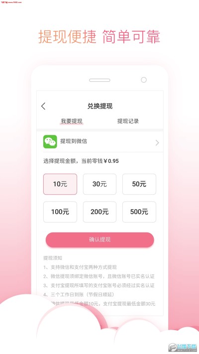 提现要求:首次满2元即可申请提现到微信,之后每次满10元提现,当天到账