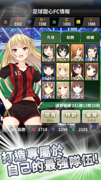 游戏以萌少女为一大卖点,但是却出乎意料地将足球的精髓融入到游戏中去。游戏里的每一位队员都有着不同的数值属性、擅长位置以及特殊技能。身为一位专业的教练,除了招募新人之外,训练这些队员成为顶级球员也是另一个很重要的职责。只要充分利用游戏中独特的训练与培养系统,每位玩家将能够把自己喜爱的队员打造成独一无二的Super Star。