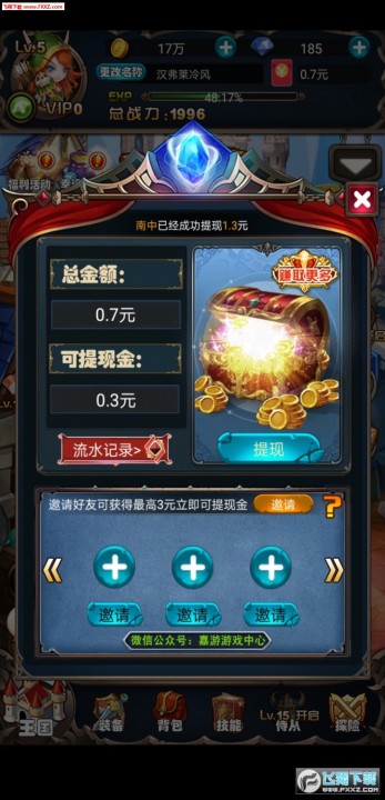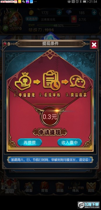 跟着游戏指引一顿点,就看到右上角有钱了。点击那个0.7元,就会出现提现界面。
