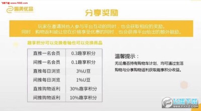 分享奖励:玩家在邀请其他人参与平台互动的同时,也会获取相应的奖励,直推一名会员0.3趣享积分,直推购物返得30%趣享积分,邀请的人越多,奖励越多。