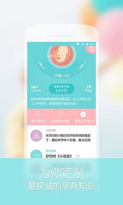 【个性定制】备孕知识、孕期知识、新生儿知识、育儿知识统统都在这里哦,每天的知识都是根据您所处阶段个性定制的哦~一个app解决您不同阶段的育儿需求,轻轻松松当个科学育儿辣妈。
