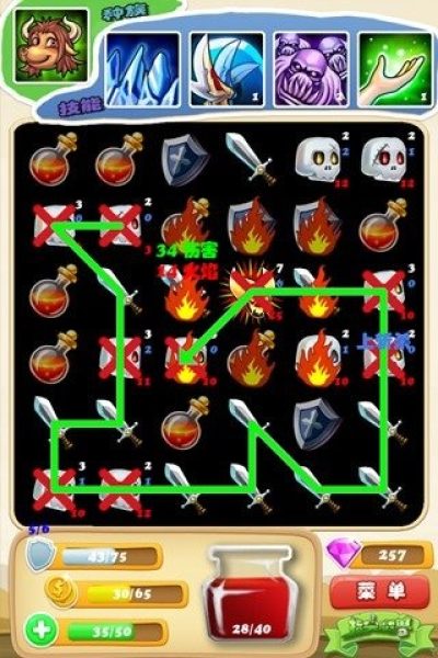 指尖魔兽共有5种类型的物件,金币,武器,血瓶,盾牌,怪物,金币能用于购买物件,武器可以用来杀死怪物,盾牌会强化你的装备,血瓶能恢复你的生命,怪物会对你造成伤害,相同类型的3种物品可以连接在一起获得收益,武器可以同怪物连在一起来对怪物造成伤害。