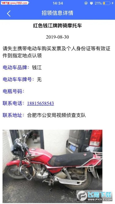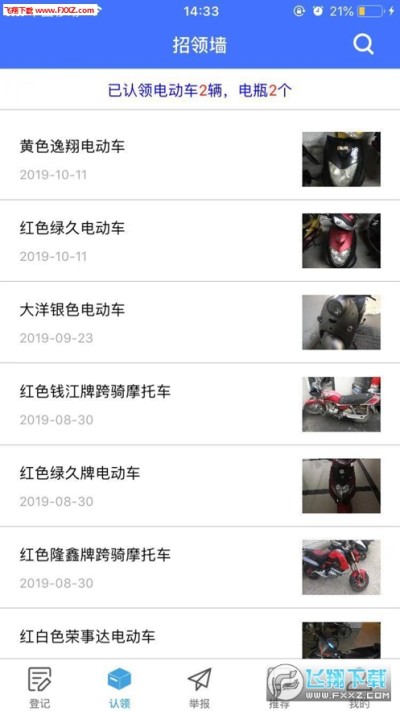 2、电动车招领墙:通过该平台发布查获电动车或电瓶的招领信息,群众可凭有效证件和材料去指定地点认领。