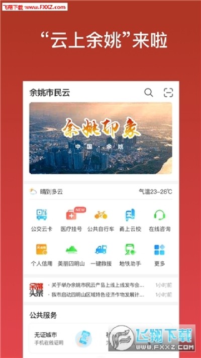 余姚市民云是一款集成余姚市民各类生活信息的城市及公共服务移动应用软件。是以“智慧城市”建设为基础,以“普惠民生”为宗旨,以广大居民能够足不出户,随时随地享受优质服务和生活便利为目标,整合政府相关部门和公共事业单位的相关服务资源和权威信息,为余姚市民精心打造的一款涵盖医疗、交通、旅游、便民、政务等方面的本地化生活服务手机软件。