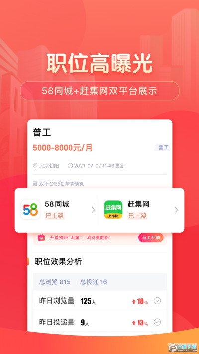 58同城旗下一款专为商企端打造的专业级招聘平台,简历库由58同城、赶集网双平台接入,您可同步邀约双平台求职者,帖子可获得更多曝光,招人更快更方便。