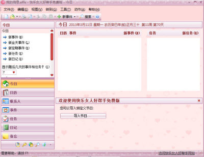 快乐女人好帮手集通讯录、日程安排、任务计划、公历农历、电子日记、便笺备忘、密码管理、网址收藏等诸多功能于一身。具有集成化的界面,统一的操作方式,无需分别打开几个不同的程序来管理个人事务。